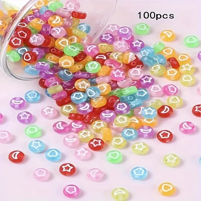 100ks 7 mm akrylových vícebarevných korálků, vzor hvězda, měsíc, srdce a kytka.
