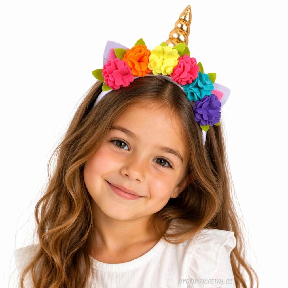 Proměňte každou holčičku v kouzelnou princeznu! Tato nádherná čelenka jednorožec je zdobená výraznými duhovými květy a zlatým rohem, který okamžitě upoutá pozornost.