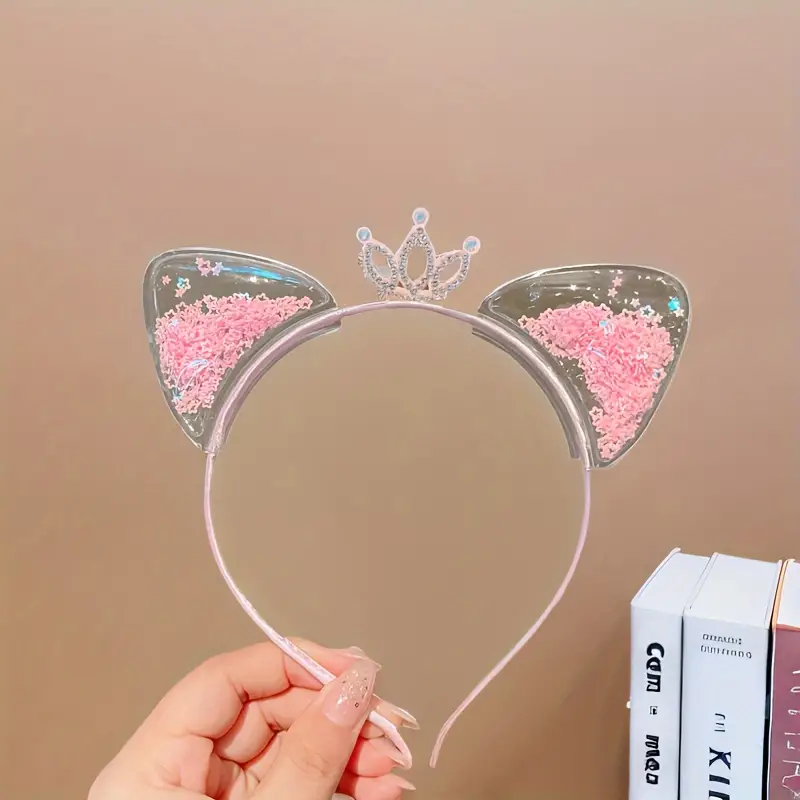 Čelenka do vlasů kočičí ouška s korunkou Korunka s třpytivými kamínky Kovová čelenka potažená saténovou látkou Průsvitné plastové uši, uvnitř různé zdobení, které se přesýpá Uši se dají posouvat celý popis