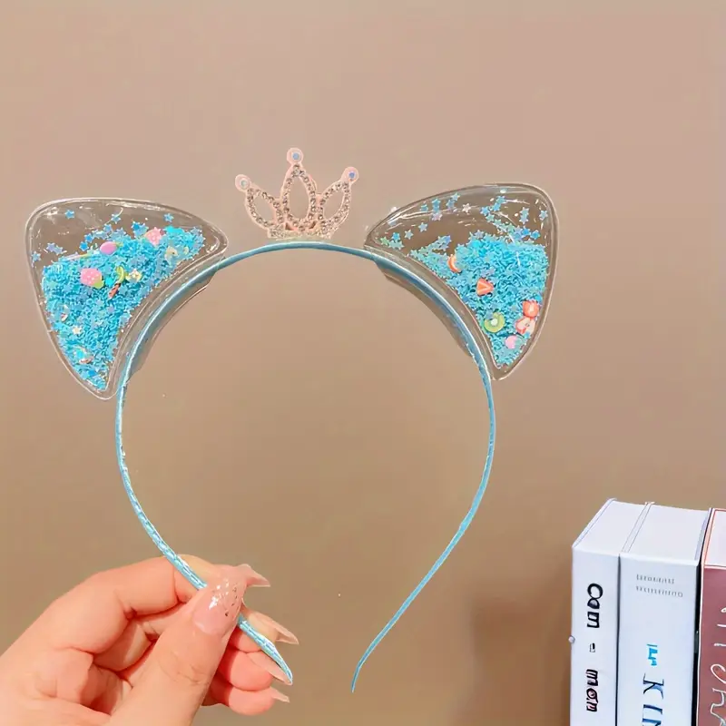 Čelenka do vlasů kočičí ouška s korunkou Korunka s třpytivými kamínky Kovová čelenka potažená saténovou látkou Průsvitné plastové uši, uvnitř různé zdobení, které se přesýpá Uši se dají posouvat celý popis