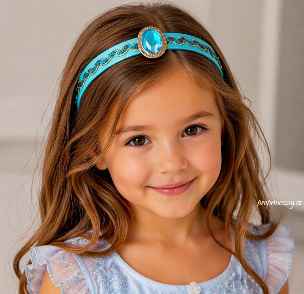 Proměňte každou malou slečnu v opravdovou princeznu ✨ Tato nádherná čelenka inspirovaná princeznou Jasmínou zaujme na první pohled díky výraznému tyrkysovému kameni uprostřed a jemným zlatým detailům po celé délce.