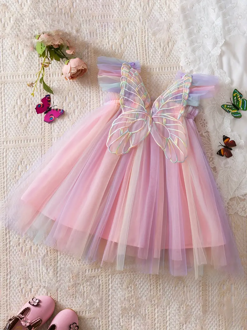 Tyto nádherné dívčí šaty s motýlem jsou snem každé malé princezny. Pastelová kombinace růžové, fialové a jemných tónů vytváří kouzelný pohádkový vzhled.
