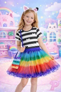 Tento krásný kostým Gábi je ideální na karneval, narozeninovou oslavu, focení i domácí hraní. Kombinuje pohodlné pruhované tričko s bohatou duhovou tylovou sukní, která krásně drží tvar a působí opravdu pohádkově.