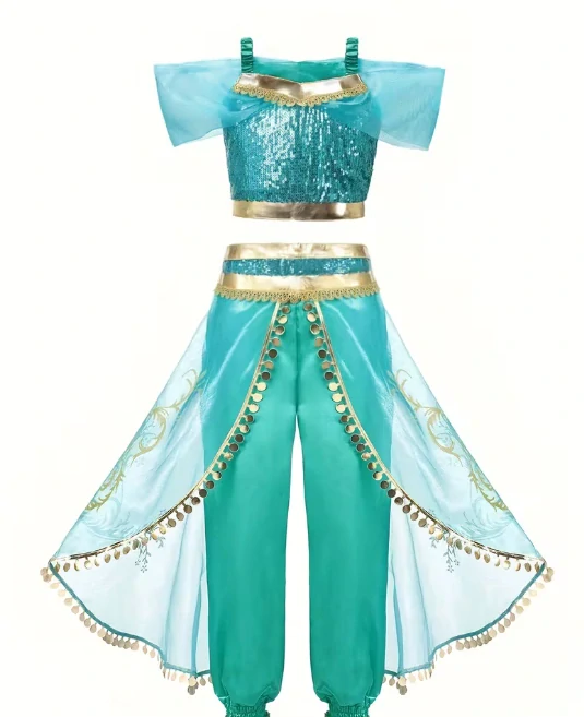 Tento nádherný dětský orientální kostým je jako vystřižený z pohádky Tisíce a jedné noci. Set se skládá z elegantního topu a pohodlných kalhot, které společně vytváří okouzlující pohádkový vzhled.