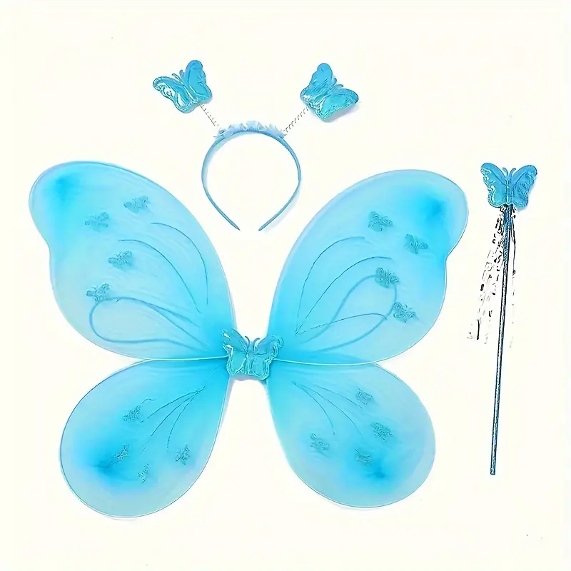 Proměňte svou malou princeznu v kouzelného motýla s tímto jedinečným outfitem! Sada obsahuje modrá motýlí křídla a také čelenku a hůlku, díky kterým se každá holčička bude cítit jako skutečná víla z pohádek.