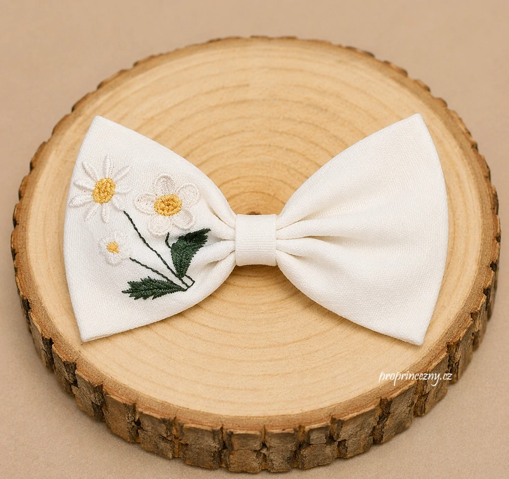 Látková vyšívaná mašle do vlasů – jemný květinový motivSkladem > 5 ks130 Kč/ ks