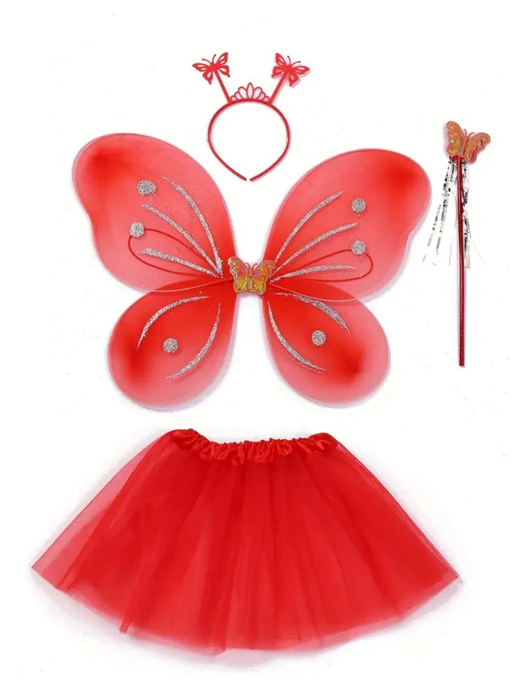 Proměňte svou malou princeznu v kouzelného motýla s tímto jedinečným outfitem! Sada obsahuje červená motýlí křídla, sukni a také čelenku a hůlku, díky kterým se každá holčička bude cítit jako skutečná víla z pohádek.