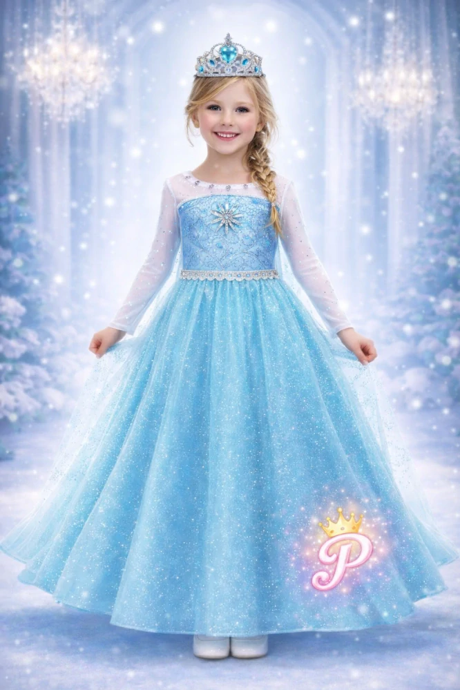 Tyto nádherné zimní šaty ve stylu princezny Elsy potěší každou malou milovnici pohádek. Třpytivá vlečka vytváří skutečný princeznovský efekt. Krásný detail vločky.