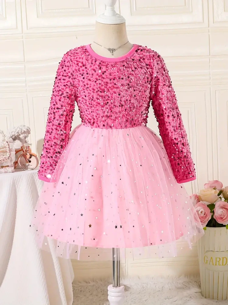Dívčí elegantní tutu šaty s flitry. Dlouhý rukáv, kulatý výstřih a tylová sukně.